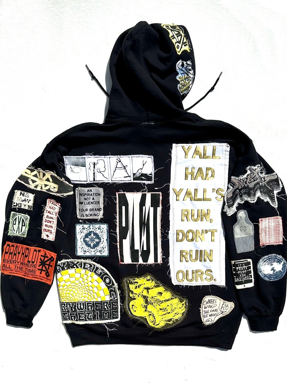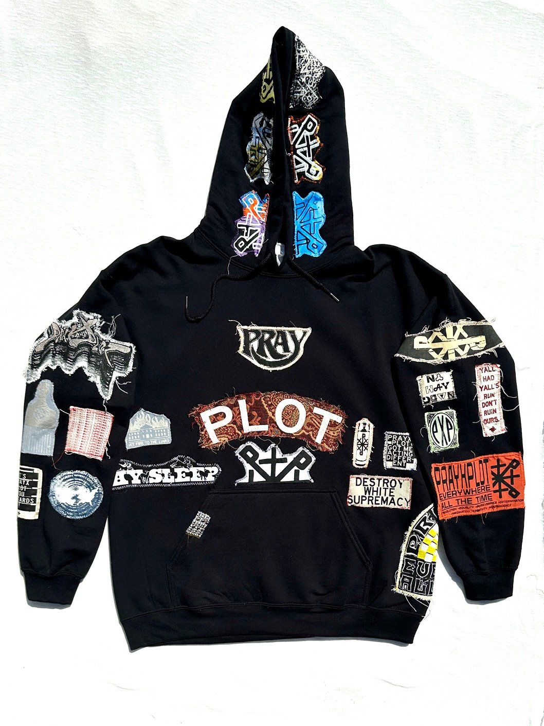 Cotton and polyester hoodie featuring custom patches on all sides and hood. #prayxplot