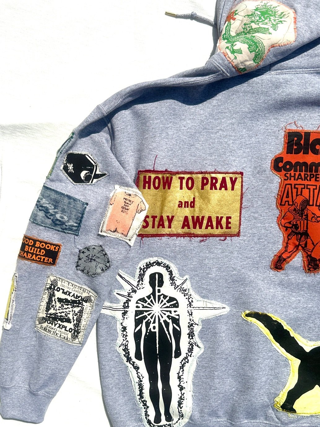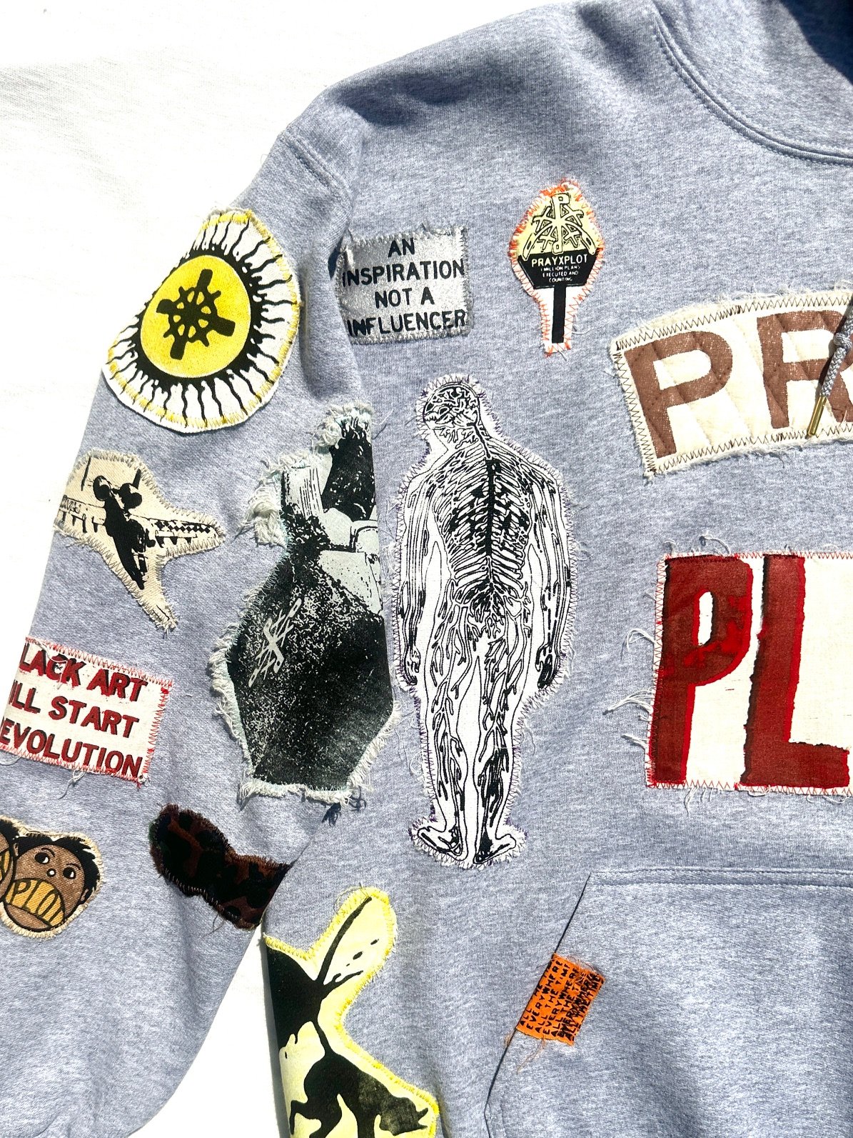 Cotton and polyester hoodie featuring custom patches on all sides and hood. #prayxplot
