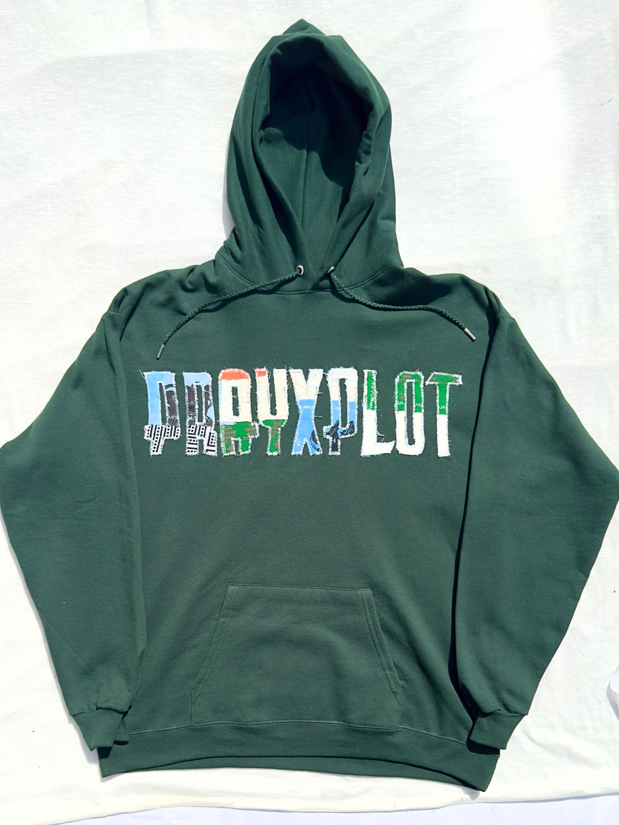 Cotton and polyester hoodie featuring a custom fabric collage pattern nameplate on front and logo on back. #prayxplot